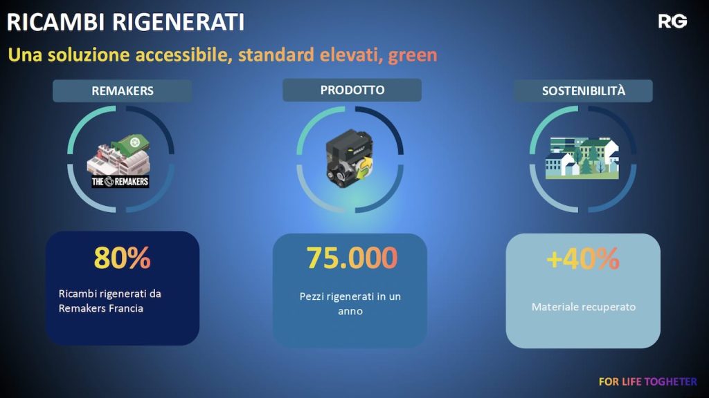 Tra le varie iniziative, ricordiamo l’avvio di un programma che prevede l’utilizzo di componenti rigenerati, inclusi i grandi sottogruppi come motori, cambi, frizioni, compressori positivo.