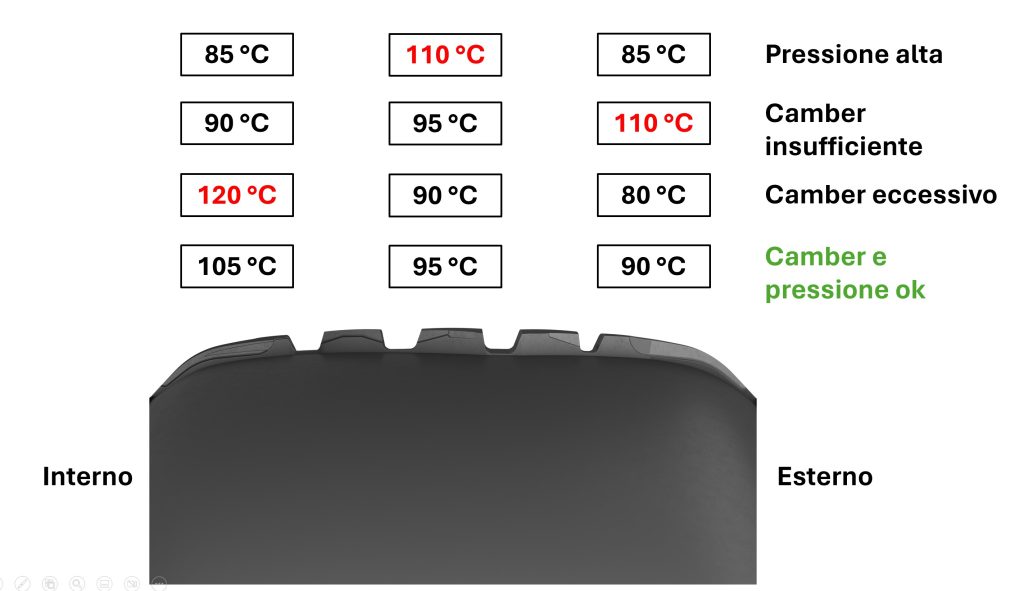 Nelle competizioni, si cerca si ottimizzare la campanatura per migliorare l’impronta a terra in curva della ruota esterna. Come visibile in figura il sistema adottato in pista per ottimizzare l’angolo di camber è quello di misurare la temperatura del battistrada in tre punti, interno, esterno e centrale, al termine di un turno di pista. Il gradiente di temperatura tra interno ed esterno del battistrada non deve, di norma, superare i 10-15 gradi, con la parte interna più calda di quella esterna. È abbastanza comune trovare invece temperature molto alte sulla parte esterna del battistrada, fenomeno che indica che lo pneumatico sta lavorando molto vicino alla spalla e quindi con una campanatura non ideale. In questo caso, è consigliato aumentare l’angolo di camber, portandolo ad angoli negativi più lontani dallo zero. Si possono raggiungere, nei casi più estremi, anche 6-7 gradi.