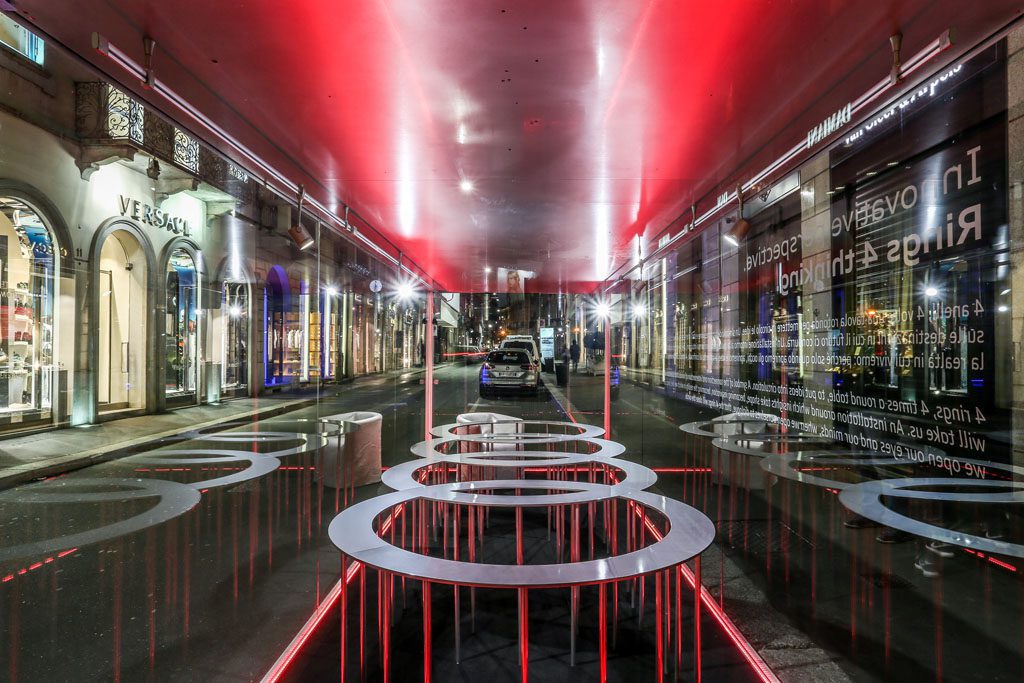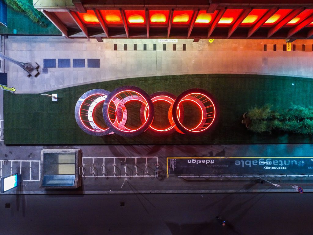 Con delle sculture metalliche che emanano e ricevono luce, Lissoni interpreta il marchio Audi e i suoi quattro anelli, simbolo dell’identità del brand. Le figure sviluppate dall’architetto raccontano tecnologia richiamando la leggerezza e la forza degli oggetti misteriosi e avveniristici dell’artista Fausto Melotti. In equilibrio perfetto tra potenza e leggerezza le due micro architetture disegneranno la presenza di Audi nella geografia della città durante la settimana del Design.
