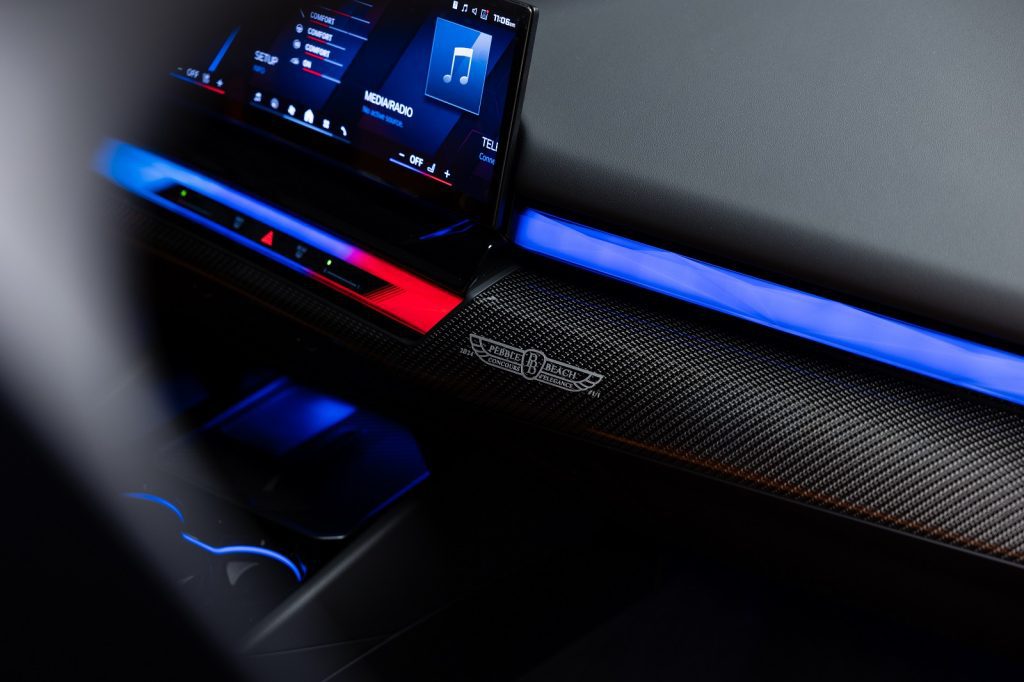L’interno è invece caratterizzato da una particolare combinazione di colori che vede il Kyalami Orange abbinato alla pelle Silverstone Extended Merino e i poggiatesta rifiniti con il logo del Concorso di Eleganza di Pebble Beach. I loghi Pebble Beach compaiono anche sul battitacco delle portiere anteriori e a destra dello schermo dell’infotainment.