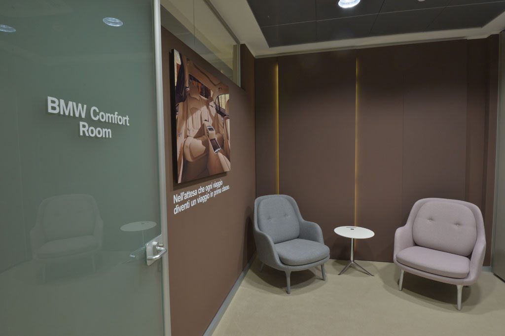 Gli ambienti di questa nuovo spazio dedicato ai businessmen sono caratterizzati dall’utilizzo di materiali e arredi che richiamano gli interni della nuova BMW Serie 7, l’ammiraglia del costruttore tedesco: rivestimenti con pannelli “Smooth Touch” alle pareti, declinati nelle tonalità del beige e del marrone – con tocchi blue notte – per le moquette dei pavimenti e per le tinte delle pareti, alluminio spazzolato per i dettagli di pareti, porte e serramenti. Inoltre, ad accogliere gli ospiti fa bella mostra di sé uno standing desk dal design moderno, mentre alle pareti dei corridoi e delle stanze meeting si possono ammirare quadri con inserti dei materiali e delle finiture nello stile del marchio tedesco.