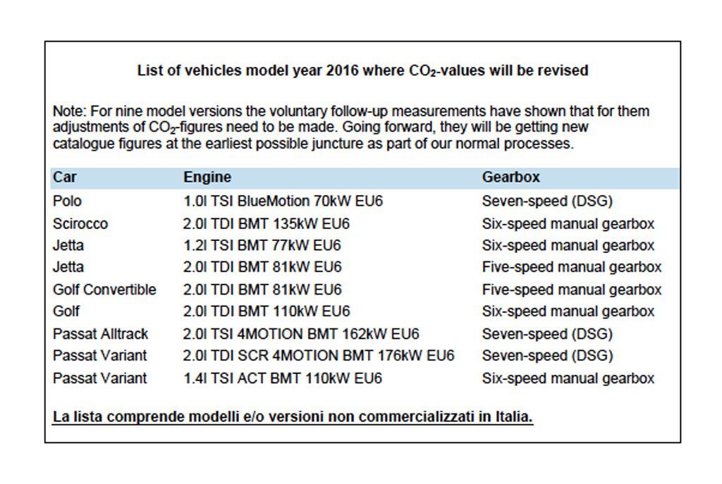Volkswagen ha presentato questi risultati alla commissione investigativa del Governo Federale e all’Autorità Federale per i Trasporti tedesca (KBA). I circa 800.000 veicoli inizialmente stimati dal Gruppo Volkswagen non sono pertanto confermati. Le variazioni di pochi grammi in media di CO2 dei dati sono state riscontrate soltanto in nove versioni Volkswagen e corrispondono a un aumento del ciclo dei consumi (NEDC) approssimativamente da 0,1 a 0,2 litri per 100 chilometri. Con una produzione annuale di circa 36.000 veicoli, queste versioni corrispondono solo allo 0,5% del volume della marca Volkswagen. Anche le altre marche del Gruppo (Audi, SEAT, ŠKODA e Volkswagen Veicoli Commerciali), seguendo la medesima procedura, hanno già definito con le autorità competenti la loro posizione. I valori reali di consumo non cambiano e non è necessario alcun intervento tecnico. Pertanto l’impatto negativo sugli utili, inizialmente previsto attorno ai 2 miliardi di euro, non è stato confermato. Se vi sarà un lieve impatto economico, dipenderà dai risultati delle nuove misurazioni.