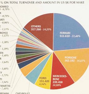 Interessante il grafico ‘a torta’ che riporta la Ferrari come marchio dominatore del mercato, col 23,46% del fatturato complessivo, seguito dalla Porsche con il 16,61% e da Mercedes-Benz col 10,98%.