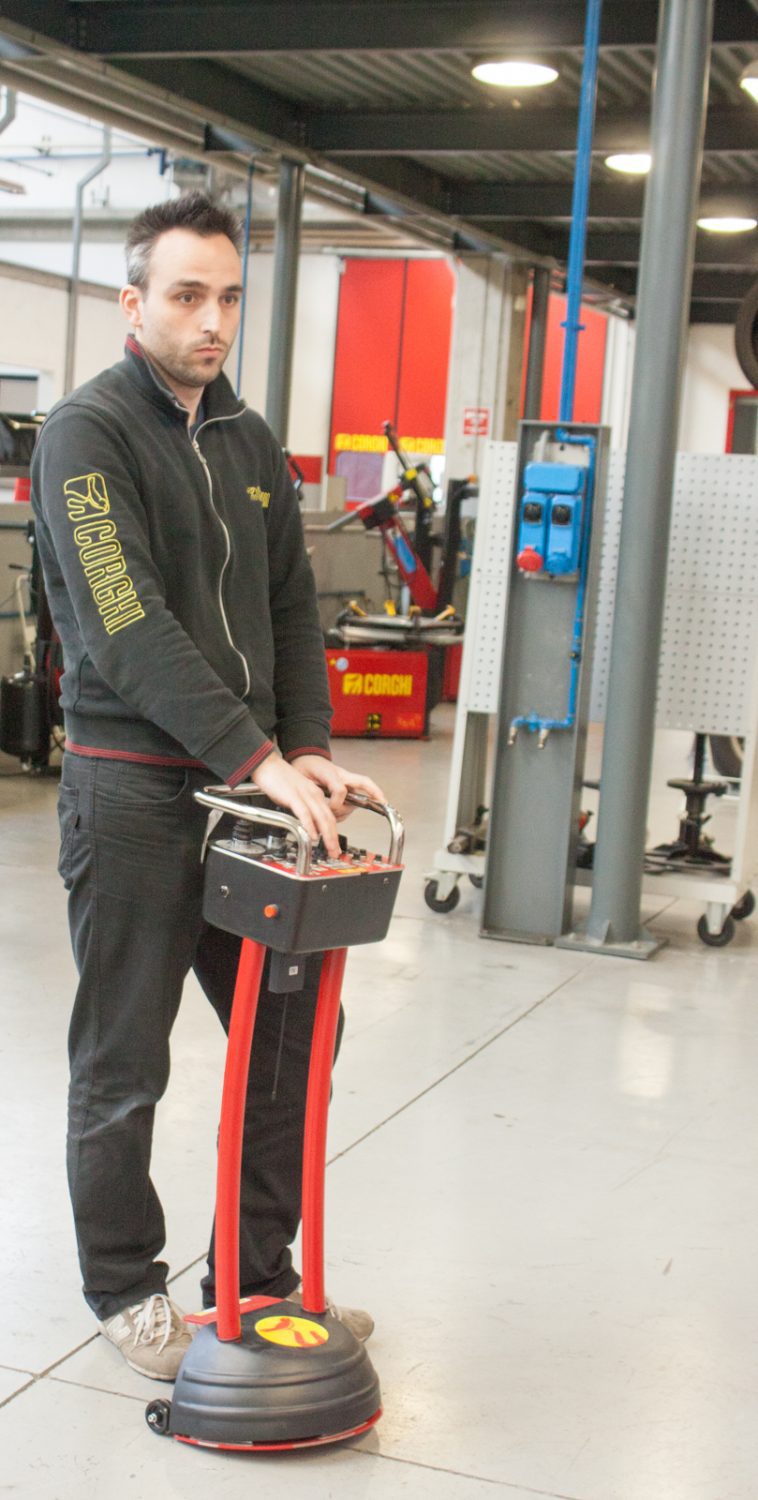 La sicurezza operativa è garantita, infine, anche dall’unità di comando trolley a ruote, separata dalla macchina stessa, che agevola il lavoro dell’operatore e comanda la centralina elettro-idraulica con display posizionabile a piacere e che permette di memorizzare tutti i dati relativi allo pneumatico in lavorazione; e la stessa torretta di comando è corredata di sistema di comando wireless, che trasforma gli impulsi elettrici applicati sui comandi stessi in segnali onde radio codificati (così da non entrare in conflitto nel caso di più macchinari montati nelle stesse vicinanze) e che assicurano una mobilità totale ed un’eliminazione del fascio di cavi, per una ulteriore precauzione di sicurezza.