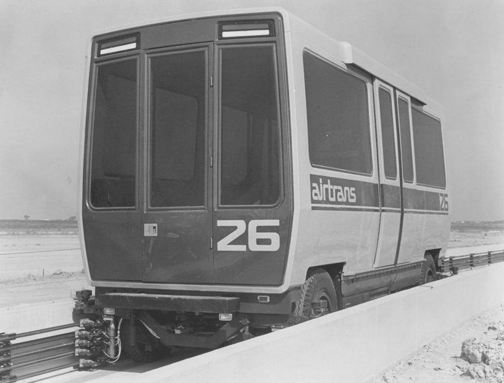 In effetti, gli affascinanti disegni che, negli anni Settanta, anticipavano l’aspetto dei “people movers” che sarebbero apparsi negli anni futuri, prefiguravano una realtà concreta. In realtà sistemi automatici di trasporto persone, soprattutto per collegare i diversi terminal dei grandi aeroporti, esistevano già. Dovendo percorrere un tragitto sempre uguale, non vi era necessità di intelligenza artificiale ed era sufficiente una sapiente applicazione di quella che allora si chiamava cibernetica. Questi minibus navetta potevano incorporare l’architettura delle monorotaie oppure percorrere corridoi dotati di basse sponde in contatto con i sensori, seguire guide nel terreno e così via. Non vi era necessità di affrontare situazioni imprevedibili. Ricordiamo i progetti della Otis, della Rohr o della Vought, per dire i primi che ci tornano alla mente, ma ce ne furono anche molti altri.