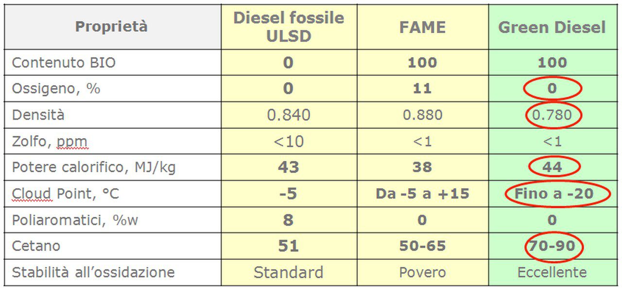 Il Green Diesel, costituito soltanto da paraffine e isoparaffine  pure, ha un’ottima stabilità chimica ed è totalmente compatibile con il diesel fossile al punto da poter essere additivato fino ad oltre il 30% (limite legato alle caratteristiche di densità imposte dalla norma EN590); è composto da molecole apolari ed è quindi idrorepellente così da evitare la contaminazione batterica ed il conseguente intasamento dei filtri; grazie agli atomi di idrogeno possiede un alto numero di cetano (il parametro che misura l’accendibilità del combustibile) e un maggiore potere calorifico che assicurano una migliore combustione, una migliore fluidità di marcia, una migliore efficienza, migliori partenze a freddo e un effetto benefico sui consumi di carburante.