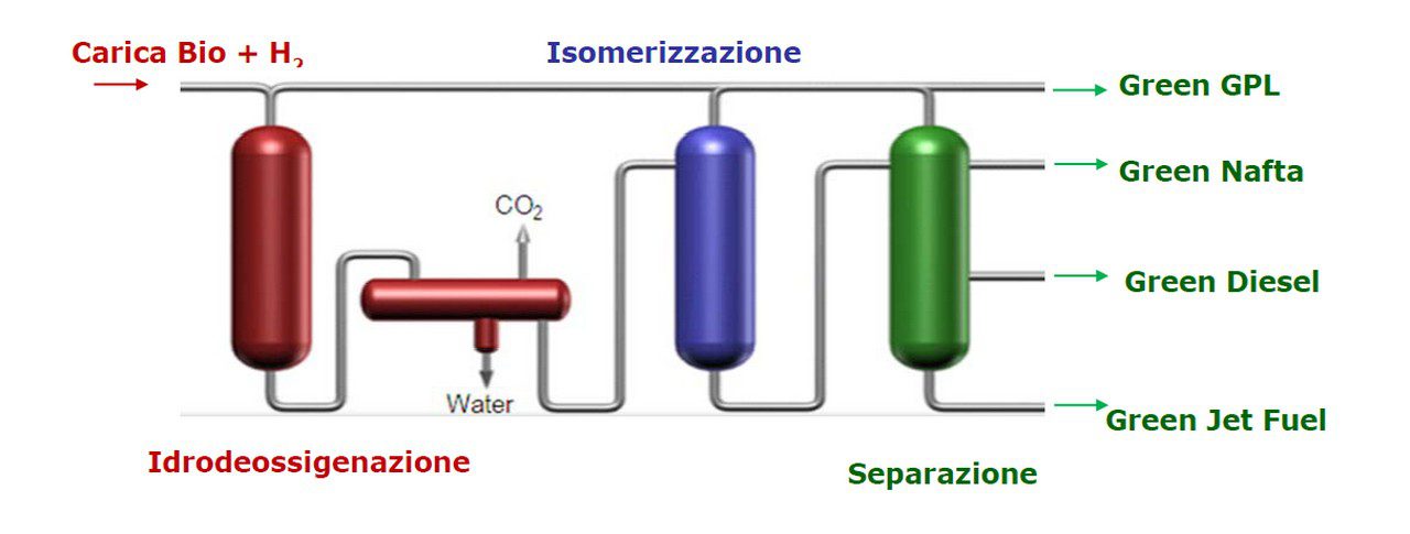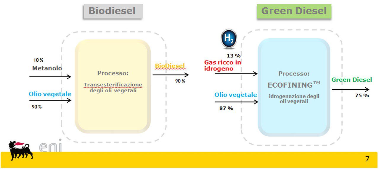 L’innovativo metodo Ecofining di produzione del Green Diesel prevede, invece, un nuovo processo di idrogenazione degli Oli vegetali (HVO = Hydrotreated Vegetable Oil) in cui una parte di Olio vegetale (Trigliceride) viene addizionato con un gas ricco di Idrogeno (H2) per formare Green Diesel + Acqua. In sostanza il metodo Ecofining è un processo Stand Alone a due stadi (idrodeossigenazione + isomerizzazione) che, utilizzando l’Idrogeno al posto del Metanolo, consente di rimuovere completamente l’Ossigeno presente negli Oli vegetali di partenza e di ottenere un prodotto idrocarburico privo di ossigeno perfettamente compatibile con il diesel fossile.