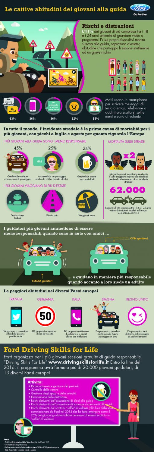 Ford ha commissionato uno studio sulle cattive abitudini dei giovani al volante per meglio comprendere quali siano i rischi alla guida, intervistando 6.500 giovani tra i 18 e i 24 anni in Italia, Regno Unito, Germania, Francia e Spagna. Lo studio svela che il 57% degli intervistati ha dichiarato di aver più volte superato i limiti di velocità consentiti, il 43% di aver inviato messaggi di testo e il 36% di aver effettuato telefonate mentre era alla guida, il 16% di aver guidato senza allacciare le cinture di sicurezza, il 15% di essersi scattato un selfie e il 13% di essersi messo al volante dopo aver assunto alcoolici. L’Ovale Blu attraverso il programma Driving Skills For Life, meglio conosciuto come DSFL, organizza per i più giovani sessioni gratuite di guida responsabile, in 13 diversi Paesi in tutta Europa. Il DSFL, lanciato in Europa nel 2013, si pone come obiettivo di formare oltre 20.000 ragazzi entro la fine del 2016. “L’estate è un momento dell’anno in cui i giovani desiderano vivere appieno l’esperienza di guida in modo libero e rilassato, sensazione che accomuna anche le generazioni precedenti” ha dichiarato Jim Graham, Manager del DSFL di Ford. “Ma sono troppe le giovani vittime di incidenti stradali a causa dell’inesperienza e della poca reattività alle situazioni impreviste che possono prospettarsi sulle strade”.