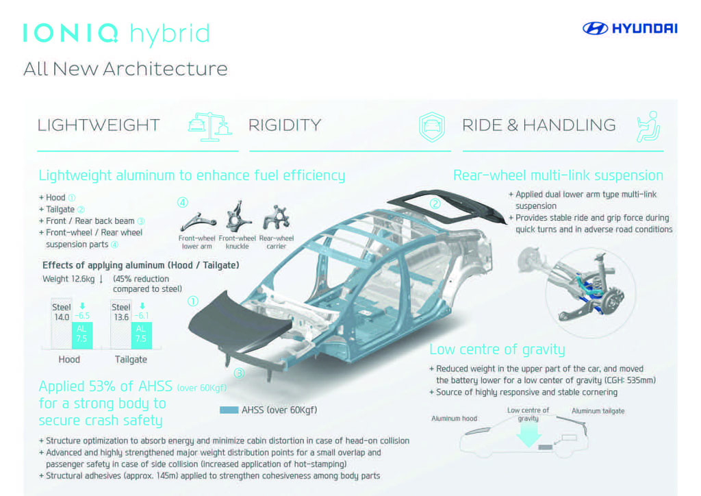 Sotto l’originale design a cinque porte, IONIQ cela un telaio creato appositamente per ospitare tre differenti propulsori a basse emissioni. Si tratta di una struttura realizzata per il 53% in AHSS (Acciaio Avanzato ad Alta Resistenza), sapientemente abbinato al leggero alluminio: complessivamente, questa scelta ha fatto risparmiare 12,6 kg (45%) nella produzione di componenti non strutturali come il cofano, il portellone posteriore ed altri elementi delle sospensioni. Nelle aree dove è invece necessario assorbire al massimo l’energia sprigionata in caso d’urto od incidente, è stato impiegato acciaio ad alta resistenza di ultimissima generazione.