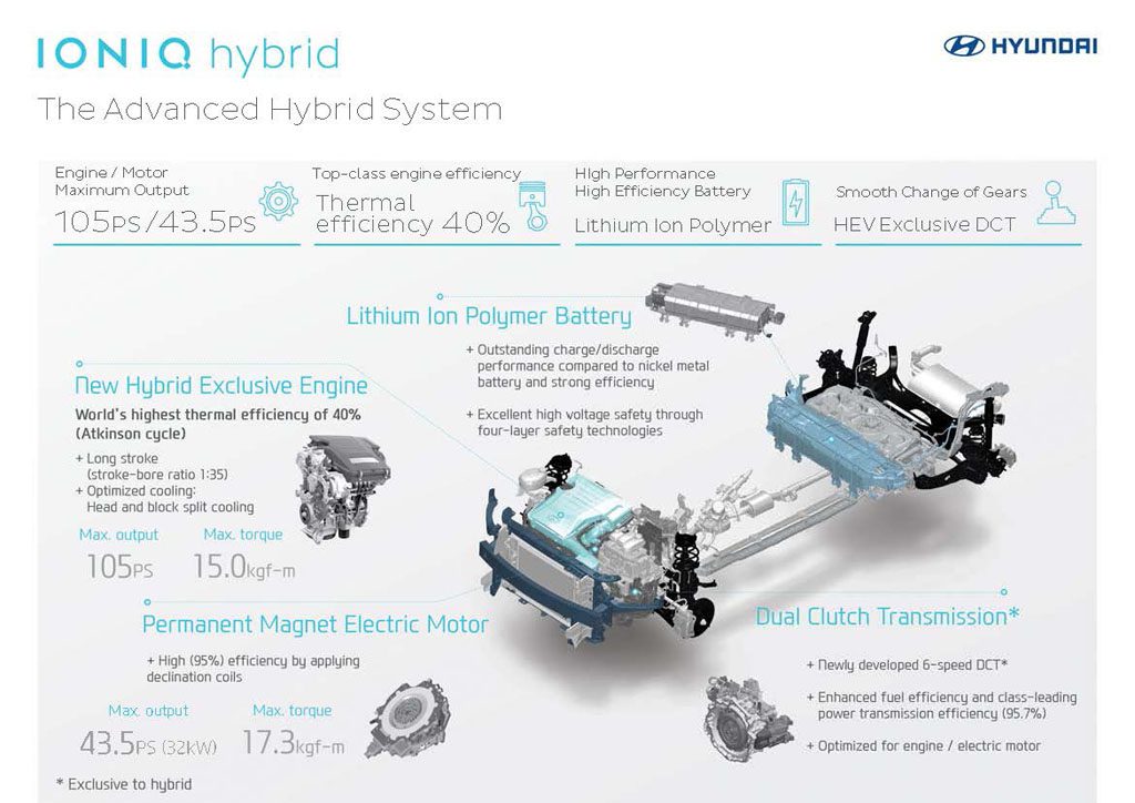 Il propulsore scelto per la nuova IONIQ ibrida è il nuovo 1.6 litri GDi serie ‘Kappa’, sviluppato esclusivamente per i motori ibridi Hyundai, in grado di combinarsi perfettamente con l’inedita unità motrice elettrica. Erogano rispettivamente una potenza massima di 105 CV (1.6 GDI) e 43,5 CV (motore a magneti permanenti). In particolare, il nuovo 1.6 GDi raggiunge la miglior efficienza termica al mondo (40%). Testata e blocco motore sono ora distinti e separati per ottimizzarne il raffreddamento, mentre l’impianto d’iniezione diretta GDi ad alta pressione (200 bar) sfrutta inediti iniettori a 6 ugelli, ottimizzando ulteriormente il consumo di carburante e le emissioni di CO₂.