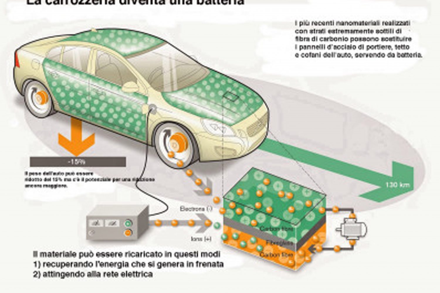 Abbiamo già avuto modo di occuparci delle batterie di nuova generazione (v. Auto Tecnica N. 387, ottobre 2013) ma avevamo già parlato anche della soluzione di trasformare elementi della carrozzeria delle auto in accumulatori di elettricità (v. N. 373 agosto 2012), con riferimento agli studi della Lola e della BAE Systems inglesi. In effetti, su una ricerca analoga era già impegnata, almeno dal 2010, la Volvo che aveva ipotizzato che con il ricorso ai nanomateriali ed alle relative tecnologie si sarebbero potuti sostituire gli elementi senza funzione portante nelle carrozzerie, trasformandoli in accumulatori elettrici. Come beneficio ulteriore, il peso dell’auto si sarebbe potuto ridurre del 15%, con il potenziale per una riduzione ancora maggiore.