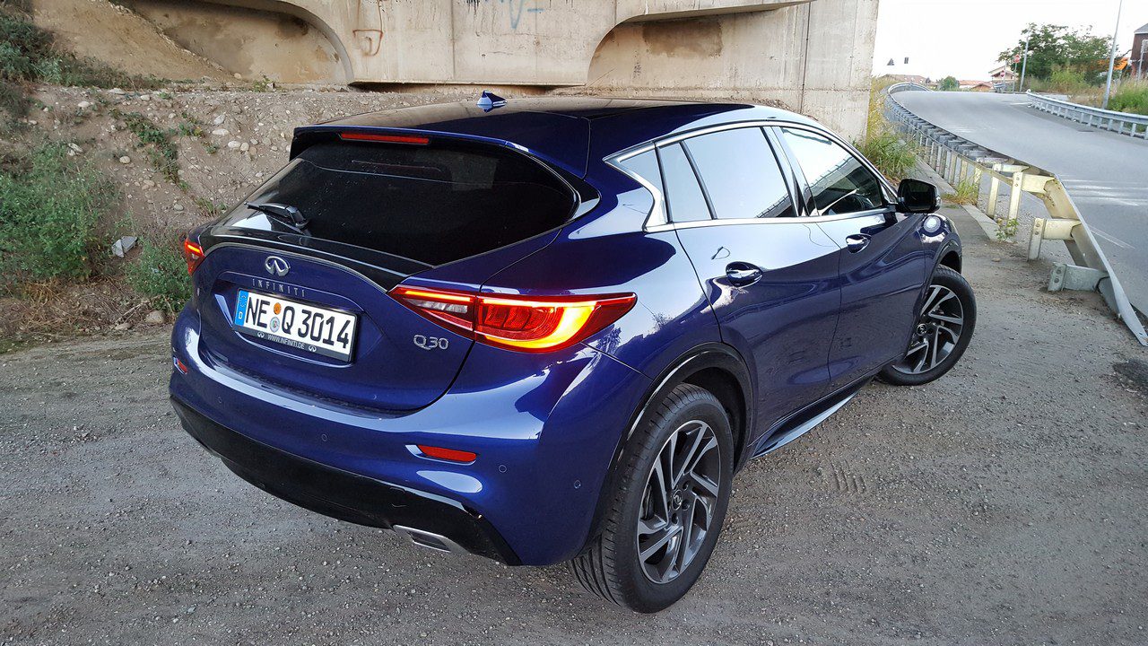 Etnie diverse che non hanno influenzato solamente la parte telaistica e meccanica ma anzi hanno spinto la Infiniti Q30 a distinguersi dalla massa sfoggiando un look non convenzionale, quasi fuori dalle righe, che ben si interfaccia con i moderni crossover o SUV di segmento C. Questo look esterno, caratterizzato da un design da coupé, dall’altezza da terra maggiorata e dalla generosa impronta su strada, è reso inconfondibile da linee decise e scolpite e da proporzioni audaci e spigolose che percorrono tutta la lunghezza della vettura, sia sul tetto che sulle fiancate, fino a raggiungere le possenti spalle o le doppie nervature sul cofano. Proiettori full led anteriori e posteriori ed esclusivi cerchi in lega da 18 pollici chiudono poi il cerchio di un design per nulla convenzionale.