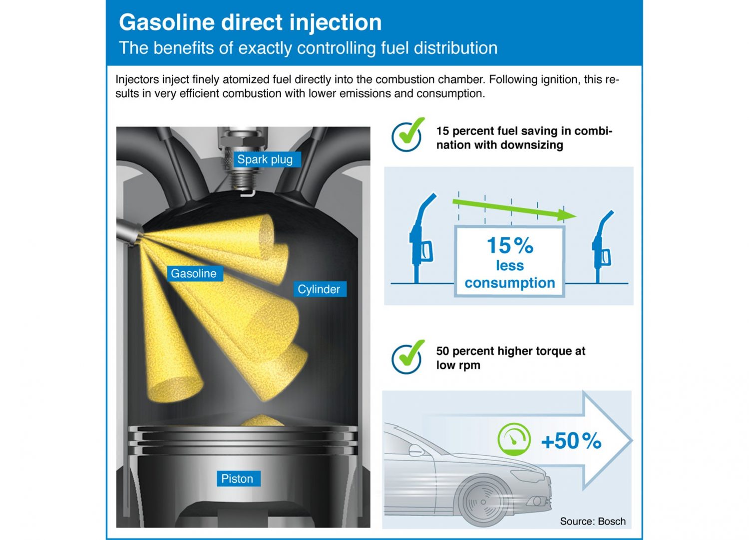 I vantaggi dell’iniezione diretta di benzina rispetto all’iniezione indiretta si possono brevemente riassumere: più potenza e coppia, meno inquinanti, minori consumi e, più in generale, maggiore potenza e coppia specifica. Il tutto ovviamente arriva a scapito di una maggiore complicazione sotto ogni aspetto: tecnologie di lavorazione, layout di progetto e tipologie di materiali.