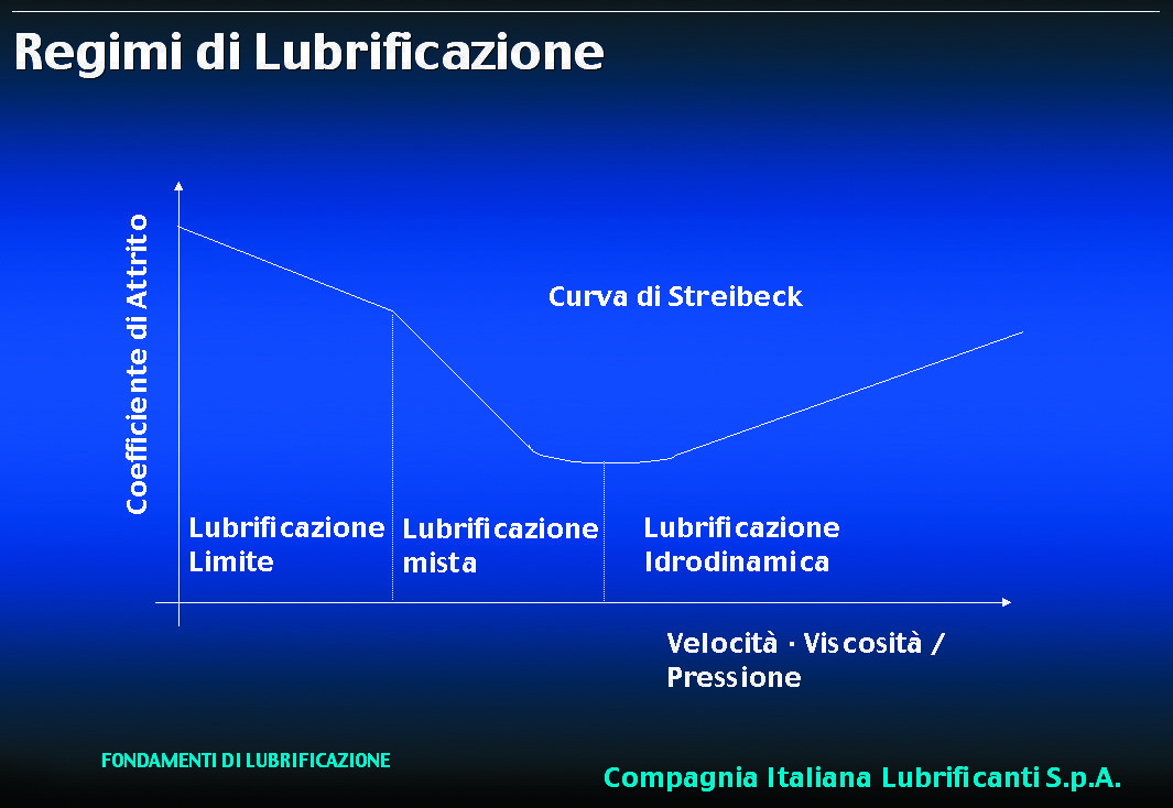 carichi elevati negli elementi quali perni di banco e manovella che iniziano a ruotare. Nel caso si instauri una lubrificazione di questo tipo assumono importanza fondamentale gli additivi presenti nel lubrificante che intervengono principalmente a modificare i valori del coefficiente di attrito e la lubrificazione è affidata ad un sottilissimo strato di lubrificante che prende il nome di epilamine. La lubrificazione idrodinamica, invece, si instaura se la quantità di olio presente è sufficiente, se la velocità delle parti in moto relativo è sufficientemente alta, i carichi non troppo elevati e la viscosità adeguata.