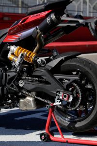 Di qualità anche le sospensioni Marzocchi, con all’anteriore una forcella a steli rovesciati (USD) e un monoammortizzatore con precarico molla regolabile: un setup tecnico da competizione.