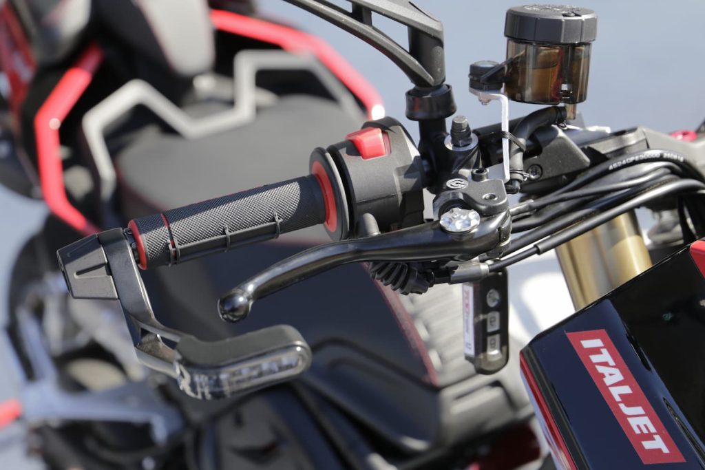 L’impianto frenante, dotato di ABS, è di derivazione racing e prevede pinze radiali Brembo a quattro pistoncini che mordono due dischi flottanti anteriori da 270mm.
