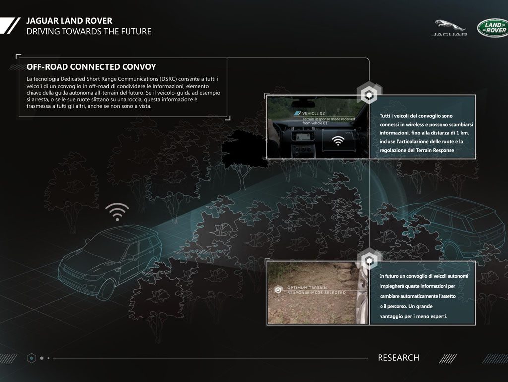 Dichiara Tony Harper: “Questo sistema di comunicazione V2V può connettere senza soluzione di continuità un convoglio di veicoli in fuoristrada. Se un veicolo si ferma, gli altri ne saranno allertati, se le ruote trovano una buca profonda o slittano su una roccia, questa informazione è condivisa con tutti. In futuro, un convoglio di veicoli autonomi potrebbe utilizzare queste informazioni per ottimizzare automaticamente le proprie regolazioni, o per cambiare percorso al fine di superare meglio un ostacolo. “Per esempio, durante un safari, il veicolo guida di un convoglio potrebbe far rallentare o fermare gli altri nel punto migliore per scattare le fotografie”.