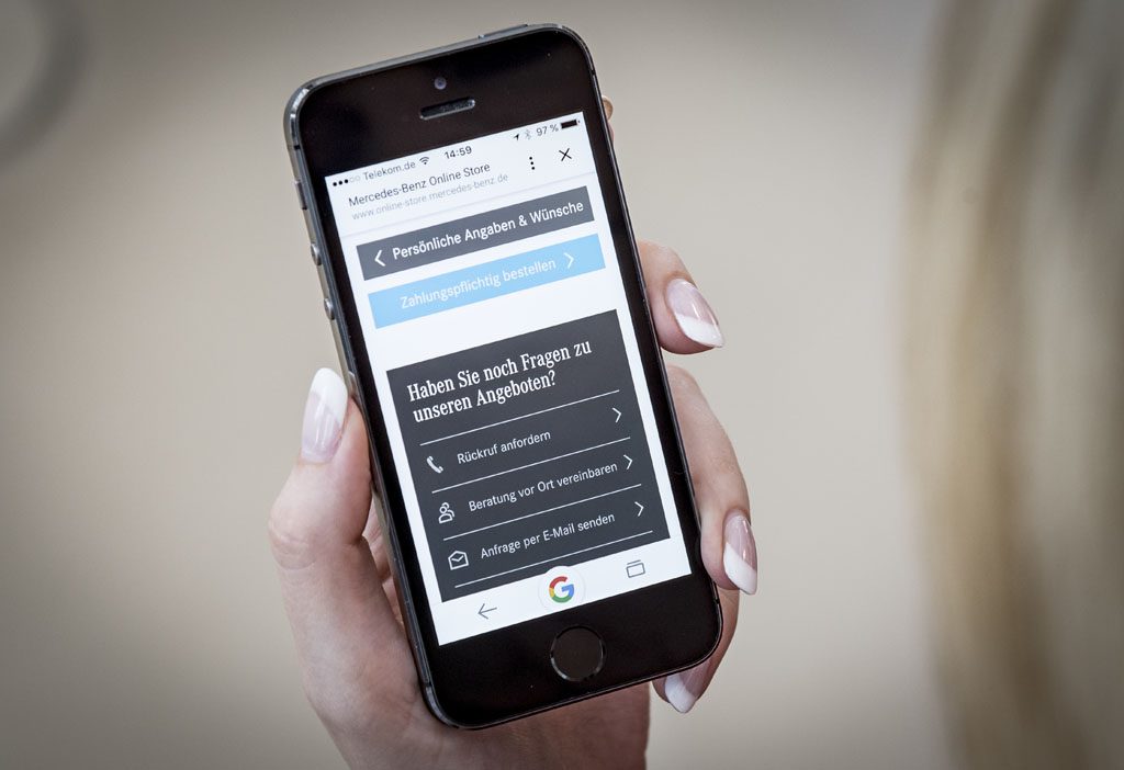 I clienti possono acquistare direttamente sul web store oppure scegliere tra vari prodotti di leasing e di finanziamento a rate particolarmente interessanti, utilizzando un link alla Mercedes-Benz Bank. La consueta procedura di identificazione della Deutsche Post, necessaria per tutti i contratti di leasing e di finanziamento, viene integrata da un’identificazione video: una webcam permette di verificare comodamente l’identità dell’acquirente ovunque si trovi. La Mercedes-Benz Bank è la prima banca di una Casa automobilistica in Germania a mettere a disposizione il riconoscimento mediante video per concludere contratti di leasing e di finanziamento. Ciò significa che, per la prima volta, l’intera procedura di vendita può essere conclusa on line 7 giorni su 7. Un calcolatore della rata on line assiste il Cliente nell’adattamento e personalizzazione delle rate in base alle sue specifiche esigenze. Il Customer Contact Center mette, inoltre, a disposizione dei clienti un team di esperti di prodotto, che possono essere contattati per telefono, e-mail ed in chat in merito a ogni domanda riguardante vettura e varie opzioni di pagamento.