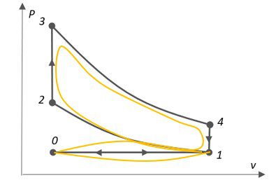 È stata spesso usata la parola “ideale” perché il ciclo “reale” (tecnicamente di definisce indicato) presenta alcune differenze che vanno a discapito di quest’ultimo. Nei motori installati sui nostri veicoli le fasi adiabatiche sono in realtà politropiche (cessione di energia sottoforma di calore), le isobare e le isocore non sono a pressione e volume costante a causa dell’inerzia che caratterizza i sistemi meccanici. La differenza tra ciclo reale ed ideale (giallo VS grigio nel disegno qui sopra) si definisce rendimento, fortemente penalizzato nel caso “reale”.