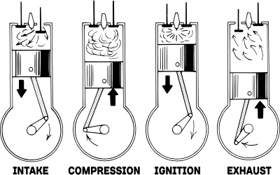 Che si tratti di un motore a due tempi (il ciclo si completa in una rotazione dell’albero motore) o di un motore a quattro tempi (due rotazioni dell’albero motore), le fasi che descrivono macroscopicamente il principio di funzionamento di un motore a ciclo “Otto” sono sempre le stesse, e sono quattro: compressione-scoppio-espansione-scarico.