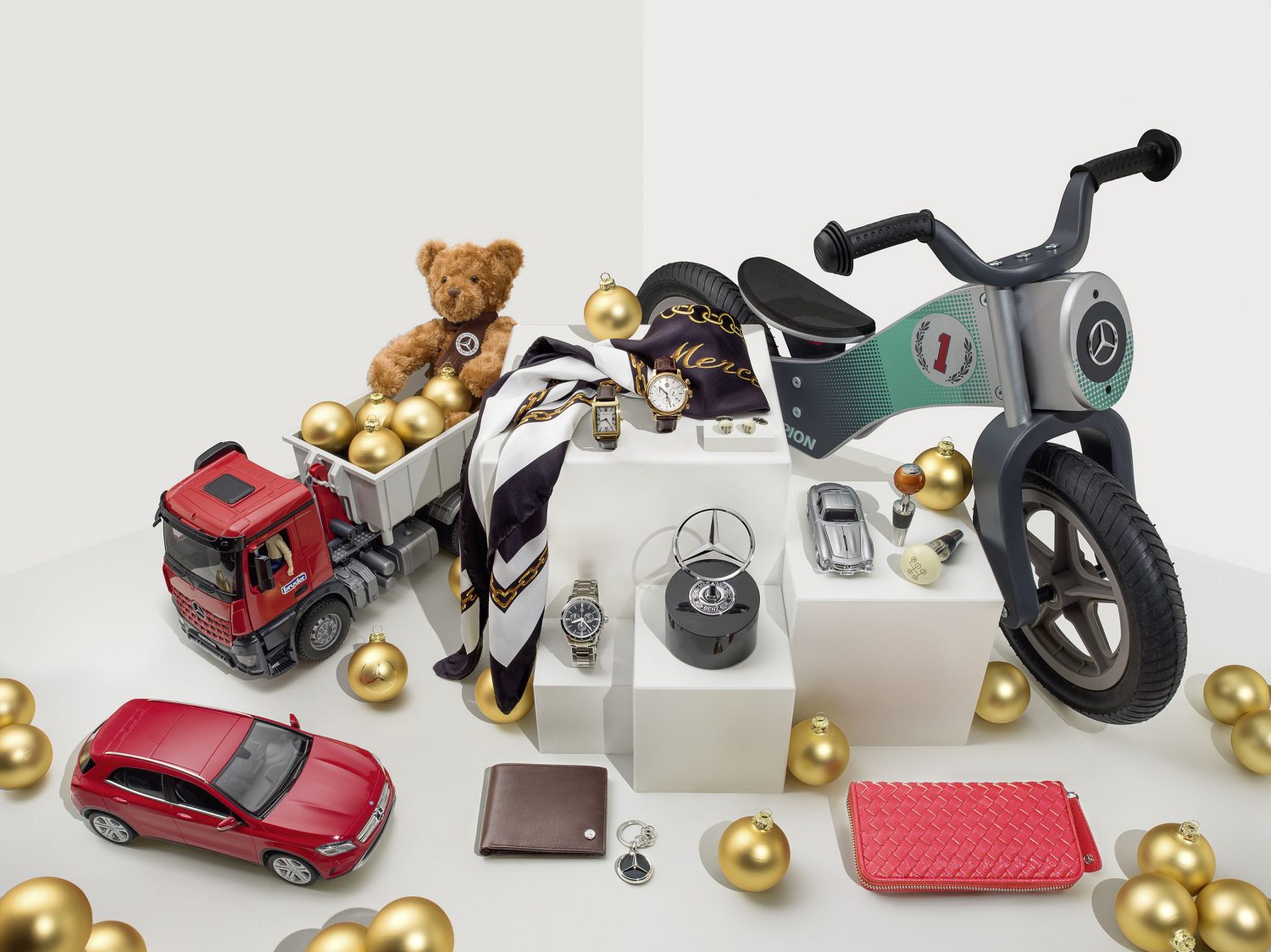 Le idee Mercedes per Natale – È già passato un anno e il Natale è alle porte. Le idee per i regali si sprecano, ma, ovviamente, al centro dell’attenzione non ci sono solo i grandi, ma anche i più piccoli, per i quali automobili, camion e moto hanno già un significato importante, sebbene prettamente ludico. Il detto secondo cui “la differenza tra un adulto e un bambino è solo il prezzo del giocattolo” è quanto mai vero, ma questa volta ci vogliamo concentrare su alcune idee Mercedes destinate ai più piccoli. Ora, a parte l’orsacchiotto Teddy Bear, che rimane sicuramente un classico, per noi che ci occupiamo di auto, moto e, ovviamente, di veicoli pesanti, l’interesse è orientato ai tre oggetti che circondano l’orsacchiotto. Si parte dall’Actros, giocattolo, che in Mercedes hanno chiamato “ride-on Actros” e che si basa su un trattore Mercedes Actros 2. L’indicazione è data per bambini al di sopra dei 18 mesi.