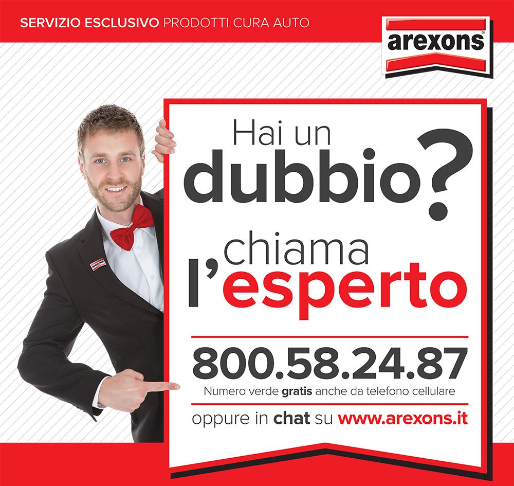 Oggi, grazie al servizio Concierge Arexons, si può curare la propria auto da soli raccontando all’esperto Arexons il tipo di problema e ottenendo consigli sul miglior prodotto Arexons da usare. Il servizio è gratuito e attivo 7 giorni su 7, dalle ore 9 alle ore 19 telefonando al numero verde 800.58.24.87. (note e dettagli di utilizzo su www.arexons.it). L’esperto Arexons è disponibile anche collegandosi al sito web Arexons (www.arexons.com), dalla pagina Facebook dedicata, tramite QR code per un accesso immediato tramite cellulare, attraverso live chat per ottenere una risposta in tempo reale con il servizio di messaggistica e via email per poter inviare foto. Arexons, da 90 anni al servizio della cura dell’auto, può vantare la conoscenza necessaria per fornire consulenza e supporto, perché curare la propria auto in modo informato, assicura un’auto sempre “in forma”.
