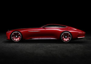 Superfici ben definite e parafanghi di forma organica si contrappongono a un profilo dalla linea chiara e slanciata. Questa linea caratteristica netta su entrambe le fiancate definisce la parte superiore del corpo vettura in tutta la sua lunghezza, dalla mascherina del radiatore alla coda. Nella parte inferiore è un volume pieno, che si estende per l’intera fiancata, a plasmare il corpo vettura sportivamente convesso. affascina anche il gioco tra la vernice rossa ‘Maybach Red’ e le modanature cromate sul bordo del parafango e al centro di cofano motore e cofano bagagliaio. Il frontale è accentuato dalla mascherina del radiatore Mercedes-Maybach reinterpretata che, con i sottili listelli verticali, ricorda il motivo gessato. La mascherina poggia su due superfici di conformazione aerodinamica a destra e a sinistra del paraurti. I cerchi da 24 pollici sono un’evoluzione del cerchio Aero della Concept IAA (Intelligent Aerodynamic Automobile). Uno schermo trasparente in tinta con la carrozzeria lascia intravedere le razze in alluminio retrostanti. Un’altra particolarità sono le porte ad ‘ali di gabbiano’, elemento che fa parte del DNA stilistico della Stella, traghettato nell’era moderna. Ornate da modanature d’alluminio di forma innovativa, accentuano anche il carattere sportivo delle fiancate. I retrovisori esterni, realizzati sotto forma di telecamere, poggiano su rinforzi chiamati ‘wing’. Con carrozzeria ‘boat-tail’, la Vision Mercedes-Maybach 6 ricorda uno yacht di lusso. Nei profili esterni della lunga coda bombata sono integrate sottili luci posteriori, che accentuano la dimensione della larghezza. Sopra spiccano i due lunotti estremamente piatti ‘split window’. Altri tratti salienti della coda sono il diffusore con bordo in alluminio e le prese di uscita dell’aria dietro i passaruota.