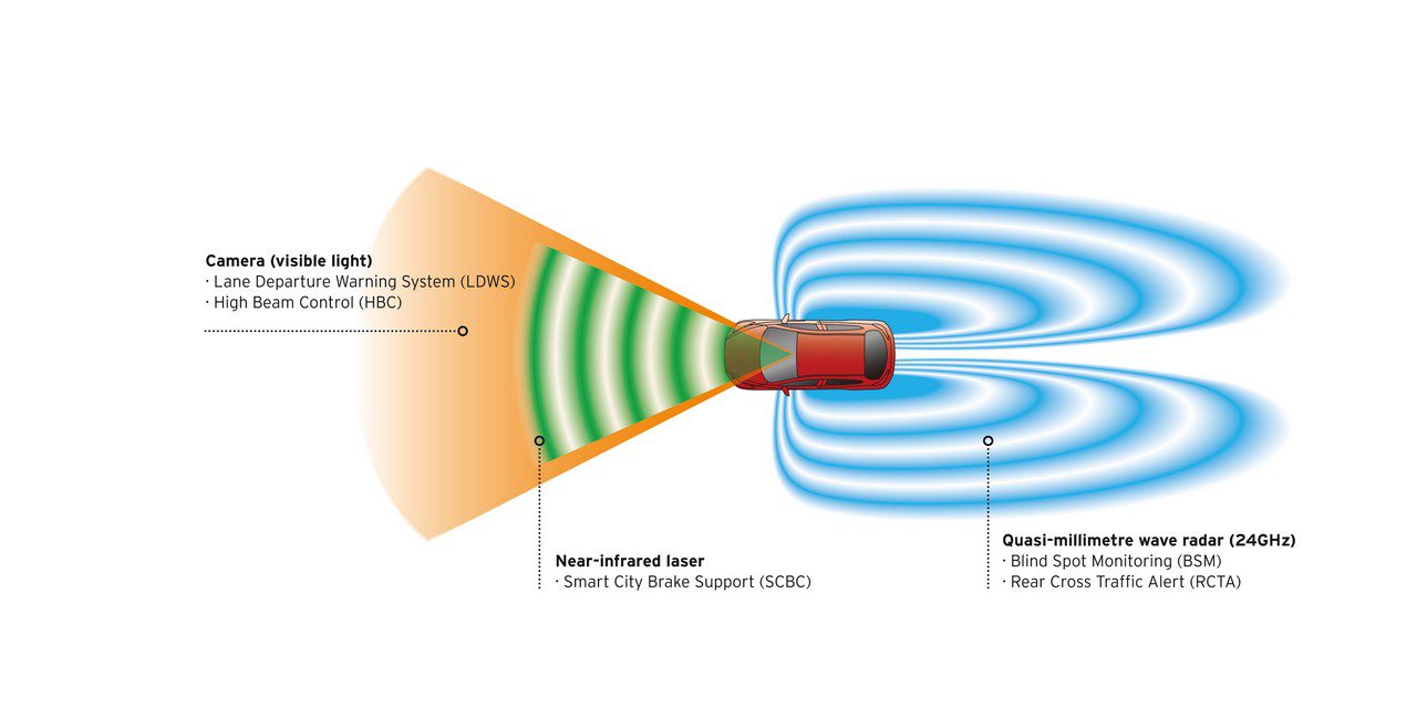 - Smart City Brake Support (SCBS) che impiega un sensore prossimo all’infrarosso per tenere un “occhio” sui veicoli che precedono entro un raggio di 6 m e a velocità comprese fra 4 e 30 km/h. Se il sistema percepisce un aumentato rischio di incidente, provvede a precaricare i freni per prepararli ad una frenata d’emergenza. Può quindi prevenire un urto a velocità sino a 20 km/h, a seconda delle condizioni della strada.