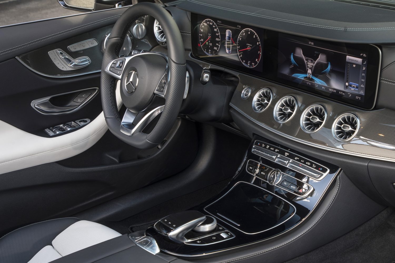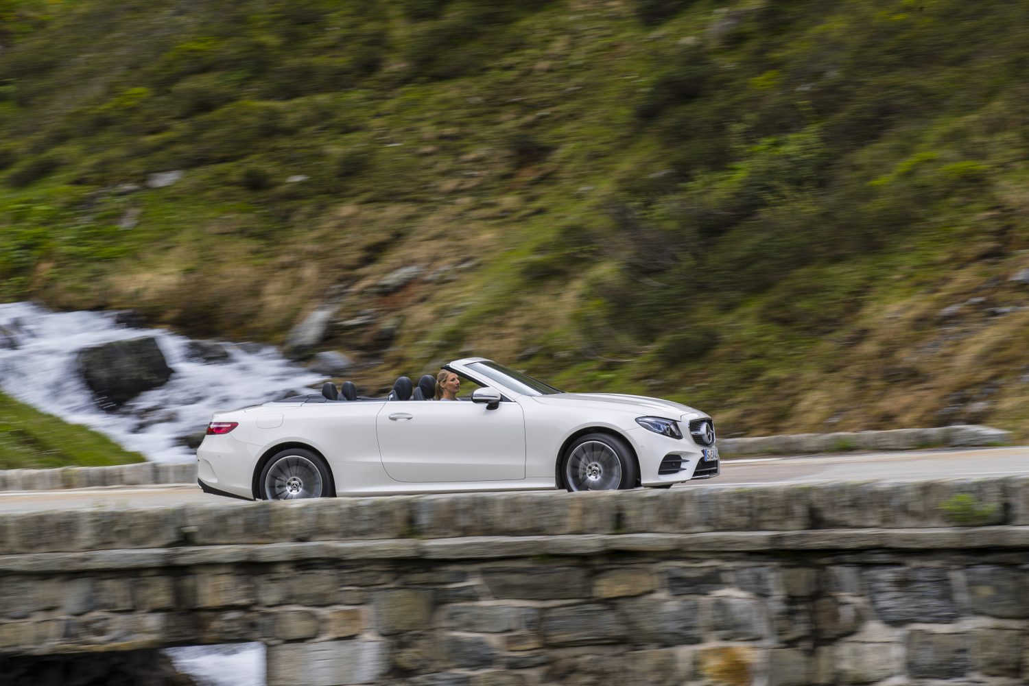 Il design pulito riprende in maniera precisa quello della Classe E Coupè sia dentro che fuori. Il frontale è caratterizzato dalla mascherina del radiatore Matrix e dai fari a LED disponibili sia in versione tradizionale che in versione intelligente (MULTIBEAM LED). La fiancata è tesa sia a capote aperta che a capote chiusa, con le ampie portiere che si raccordano con le sottili luci posteriori a LED.