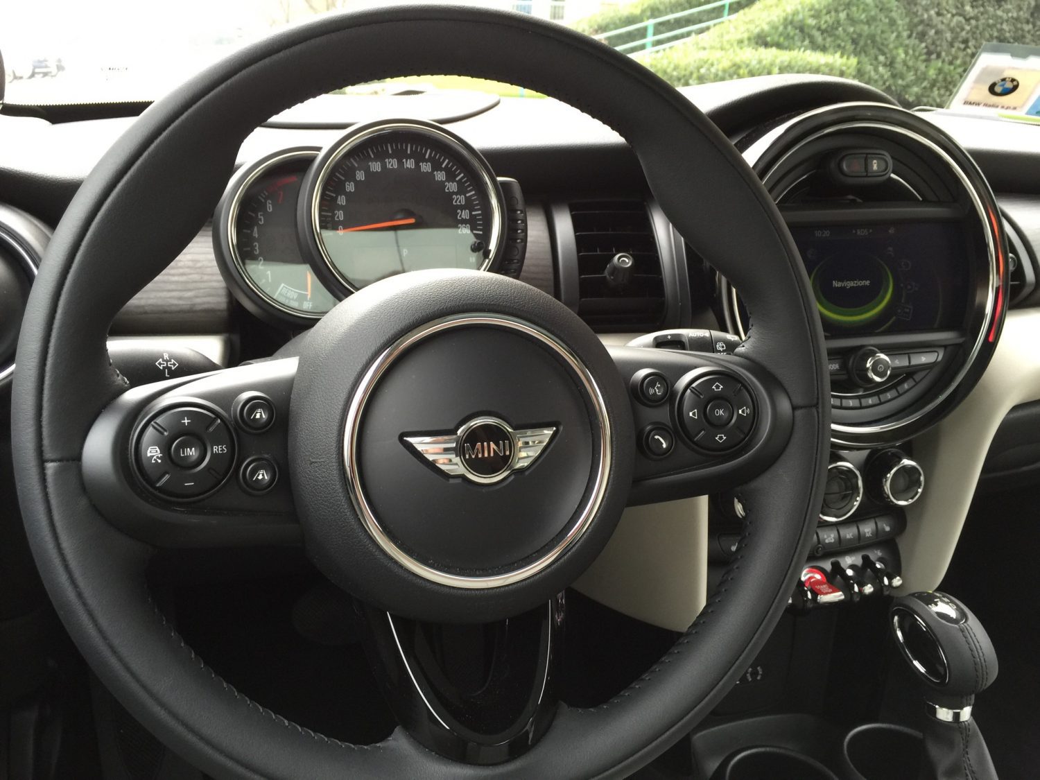 Sulla razza di sinistra trovate cruise-control e limitatore di velocità . Il primo, se volete, lo potete utilizzare con regolazione automatica della distanza di sicurezza. Cosa significa? Semplicemente, una volta impostata la distanza che vorrete mantenere tra voi e il veicolo che vi precede, la vostra Mini tenterà di viaggiare alla velocità impostata conservando la distanza. La velocità di crociera verrà quindi regolata in funzione della distanza, anche se l’obiettivo principale sarà riportarsi alla velocità impostata appena possibile. E la Mini, tutto questo… lo fa da sola. Sulla razza destra, invece, trovate i comandi del volume, quelli del telefono e anche i selettori per passare da un brano all’altro o da un nominativo all’altro della rubrica. Il radar anteriore vi avvisa, anche attraverso l’head-up display, se vi state pericolosamente avvicinando alla vettura che vi precede. Se alzate lo sguardo, nel tunnel del tetto trovate i comandi per il tetto apribile (già , l’esemplare che abbiamo in prova è, in termini di optional, veramente completo), le luci di cortesia, destra e sinistra, e un tasto che ho scopetto piacere molto ai giovani, attraverso il quale potete cambiare l’illuminazione diffusa di molti elementi dell’abitacolo, utilizzando il colore che più vi aggrada. Niente di nuovo, se pensate che questo genere di tecnologia l’ho vista parecchia anni fa a bordo di alcune vetture americane con velleità molto meno trendy. Però, sulla Mini cadono a fagiolo e il marketing del gruppo ci deve aver visto chiaro, anche perché alcuni tra i più giovani che frequentano questa redazione hanno apprezzato molto la soluzione.