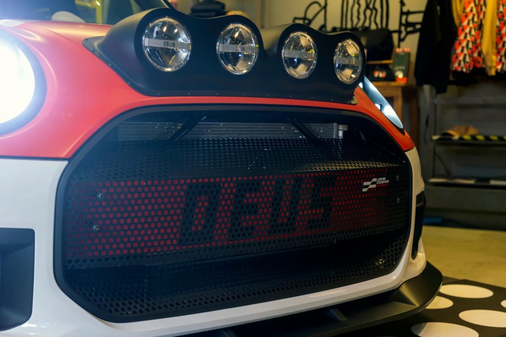 I quattro fari supplementari sul cofano, montati su un supporto applicato, rendono omaggio alle origini rallystiche della Mini (e strizzano l’occhio alla Lancia Stratos).