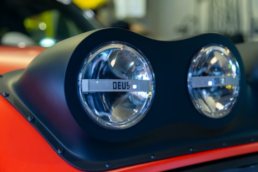 I dettagli in alluminio grezzo richiamano l’estetica funzionale dei laboratori di personalizzazione motociclistica di Deus, da Sydney a Venice Beach fino a Canggu, radicando la vettura in un linguaggio comune di performance e artigianalità.