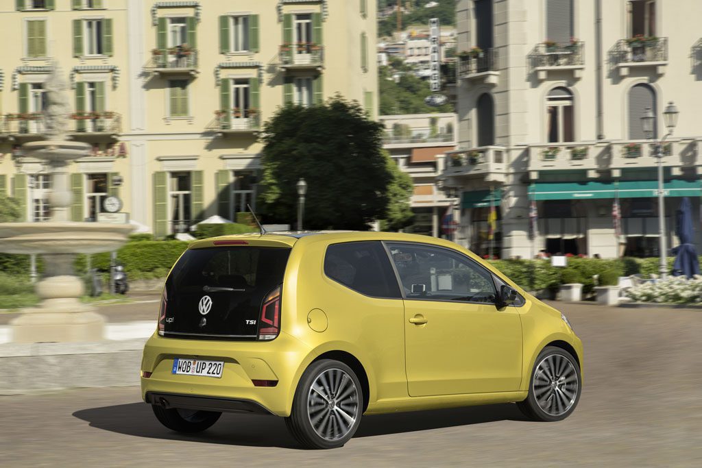 La nuova up! si distingue fin dal primo sguardo per numerose novità: fariridisegnati con luci diurne a LED, paraurti rivisitati con nuove cornici nella parte anteriore e un cofano motore dal profilo marcatamente scolpito le conferiscono un look più sportivo. La vettura ne guadagna così in imponenza e carattere. La vista laterale è dominata da nuovi cerchi (fino a 17 pollici) e specchietti retrovisori esterni ridisegnati con indicatori di direzione integrati. Non meno curato il posteriore con gruppiottici dal nuovo disegno e un accattivante diffusore.