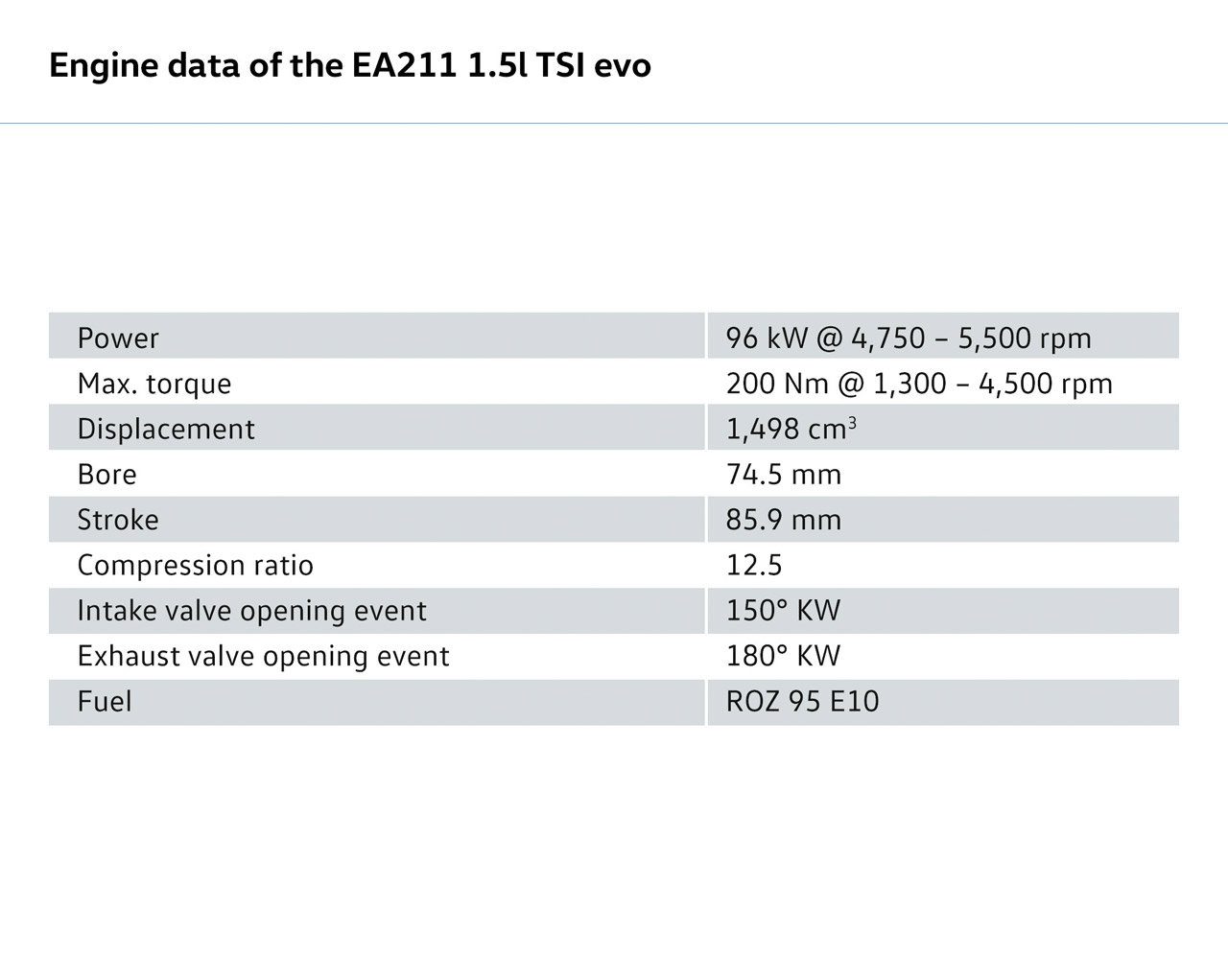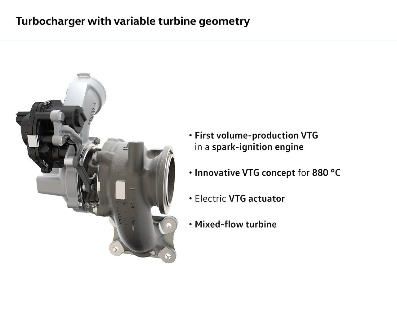 Per poter rispettare quanto promesso, il nuovo VW 1.5 TSI EVO adotta una tecnologia inedita per un motore di questa categoria. Si tratta della sovralimentazione con turbina a geometria variabile VGT azionata dai gas di scarico e controllata elettronicamente. Questa soluzione, adottata per migliorare l’erogazione della potenza e diminuire il ritardo alla pressione dell’acceleratore, ha permesso di ottenere un valore di coppia massima di 200 Nm già a 1.300 giri migliorando al contempo del 35% la risposta del motore a tutto vantaggio dell’elasticità e dei consumi.