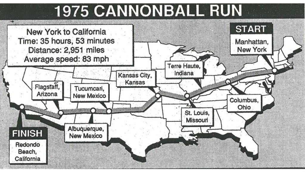 Il percorso era quello classico della Cannonball, anche se in direzione opposta rispetto alla tradizione, con partenza da Redondo Beach, in California, semplicemente perché la vettura si trovava già sulla costa occidentale.