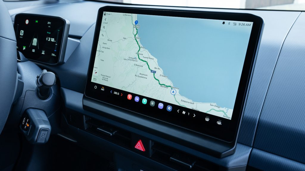 Dietro al volante, il pannello strumenti è essenziale, disegnato in modo moderno e ispirato a elementi futuristici. Centralmente c’è un display di 7” che visualizza dati di marcia e carica della batteria.