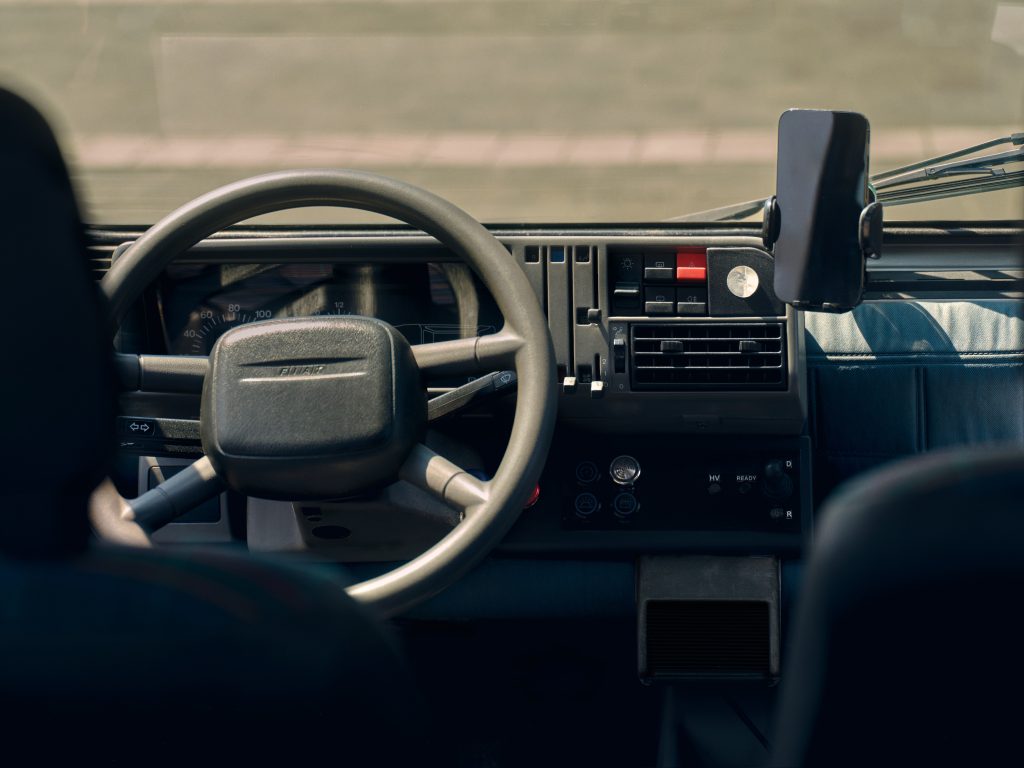 L’unica concessione alla contemporaneità è uno smartphone agganciato a una staffa, che funge da sistema di infotainment, e una piccola leva del cambio con due posizioni: una avanti e una indietro.