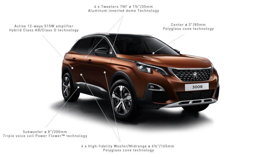 La nuova Peugeot 3008 segna anche il debutto della azienda francese FOCAL nel campo degli impianti dedicati alle autovetture: il SUV parigino può essere quindi dotato di un impianto con woofer, tweeter con tecnologia TNF, subwoofer a tripla bobina da 20 centimetri di diametro ed un sistema di amplificazione attiva ibrido Classe AB / Classe D da 515 Watt, capace di coniugare le performance da audiofilo e un consumo di energia compatibile con la sostenibilità energetica. Il risultato è un suono puro che proviene dai 10 altoparlanti montati all’interno dell’abitacolo, distinguibili dalle griglie metalliche impreziosite dal logo FOCAL sui tweeter anteriori e posteriori.