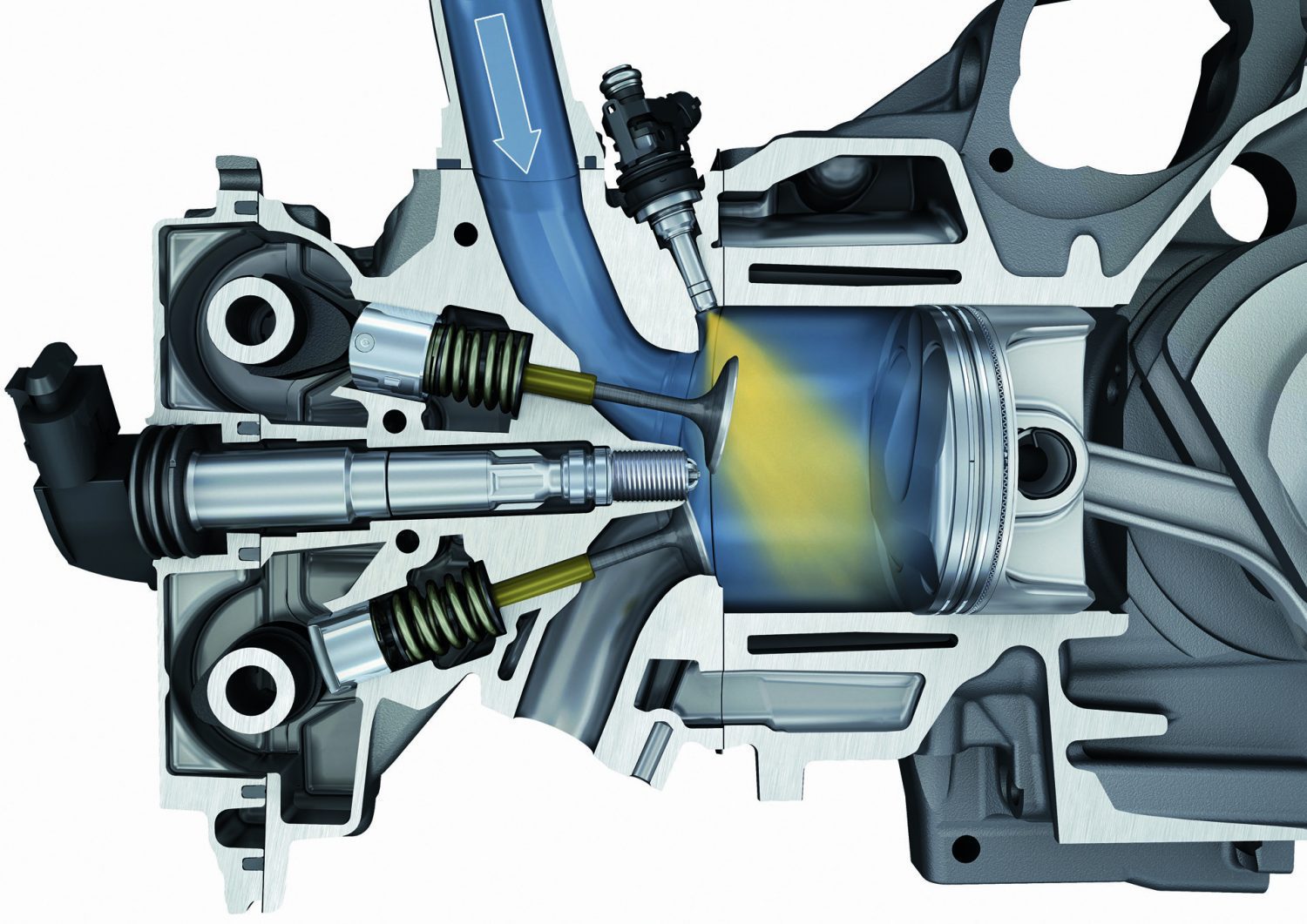 Trattasi di un’iniezione di tipo omogeneo, se si escludono i pochi minuti immediatamente successivi all’avviamento a freddo, durante i quali una logica di iniezione a carica stratificata consente di elevare fortemente le temperature in camera di scoppio, accelerando così l’entrata in temperatura dei due catalizzatori. Costruttivamente, l’iniettore è posizionato di lato, tra le due valvole di aspirazione, in modo da spruzzare il getto esattamente verso la colonna d’aria in ingresso. Tra i vantaggi più evidenti di questo tipo di alimentazione vi è, in genere, l’elevatissimo rapporto di compressione che consente di raggiungere senza incorrere nella detonazione: ben 12,5:1 nel nostro caso, con evidenti vantaggi per il rendimento.