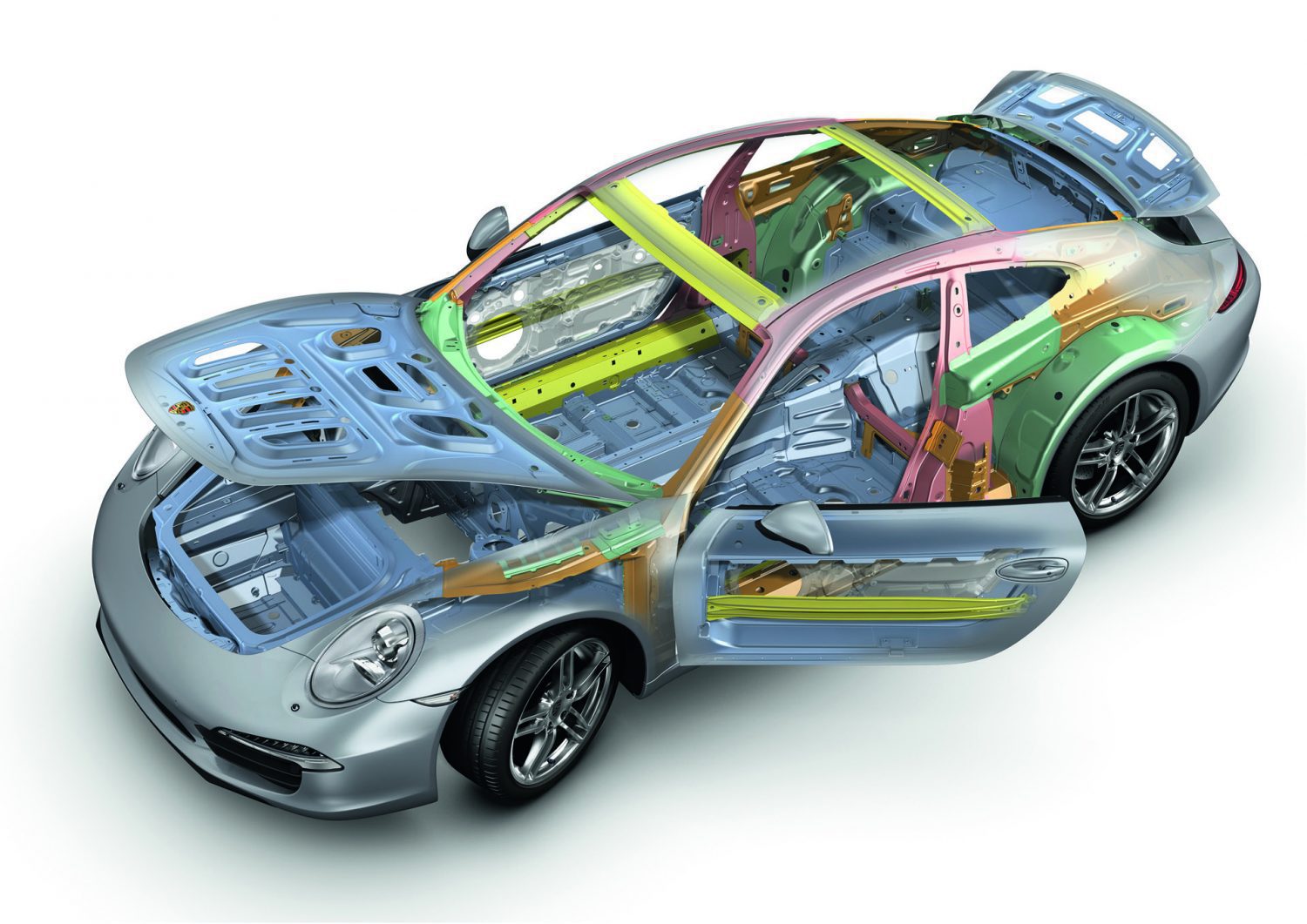 UGUALE, MA DIVERSA: Un potenziale che, lo ricordiamo, con l’avvento datato 2011 della serie 991 si è decisamente accresciuto. Merito, questo, in primo luogo del coraggio degli ingegneri Porsche, che nel ripensare per l’ennesima volta la loro creatura hanno a questo giro introdotto significativi affinamenti al “concept” 911, allungando il passo di ben 100 mm e riducendo parallelamente gli sbalzi, spostando avanti il motore di 76 mm rispetto al retrotreno e riducendo l’altezza complessiva di 33 mm. In sostanza si è portato avanti il disegno tracciato da ormai vent’anni e di cui le prime avvisaglie si erano viste con la serie 996, ovvero la lenta e visivamente quasi impercettibile migrazione dell’originale ripartizione 35-65 delle origini verso un più razionale e dinamicamente sano 40-60, dato di fatto analogo a quello di molte “centrali”. La 991 ha inoltre introdotto significative innovazioni a livello strutturale, dato che per la prima volta nella storia di questo modello si è giunti ad una vera e propria costruzione leggera multi-materiale, sulla falsariga di quanto gli altri grandi costruttori tedeschi (e l’alleata Audi in primis) proponevano già da qualche anno. In particolare, la scocca portante – prima realizzata integralmente in lamiera d’acciaio – vede ora una massiccia presenza dell’alluminio, in particolare per la sezione anteriore della struttura e per il fondo del pianale, mentre la cellula resistente dell’abitacolo è rimasta in acciaio, facendo ovviamente uso di elementi in lega alto-resistenziale in tutti i principali punti critici. Una significativa mole di ricerca e sviluppo ha poi riguardato anche le tecnologie di giunzione, che data la eterogeneità dei materiali impiegati prevede ora l’adozione estesa di chiodature, rivettature, inserti filettati ed adesivi strutturali, con il doppio risultato di ridurre la massa della scocca di 80 kg riuscendo, al contempo, ad incrementare la rigidezza torsionale statica del 25%. Una gran mole di lavoro, insomma, alla faccia della “conservazione” di cui spesso gli ingegneri di Stoccarda vengono accusati.
