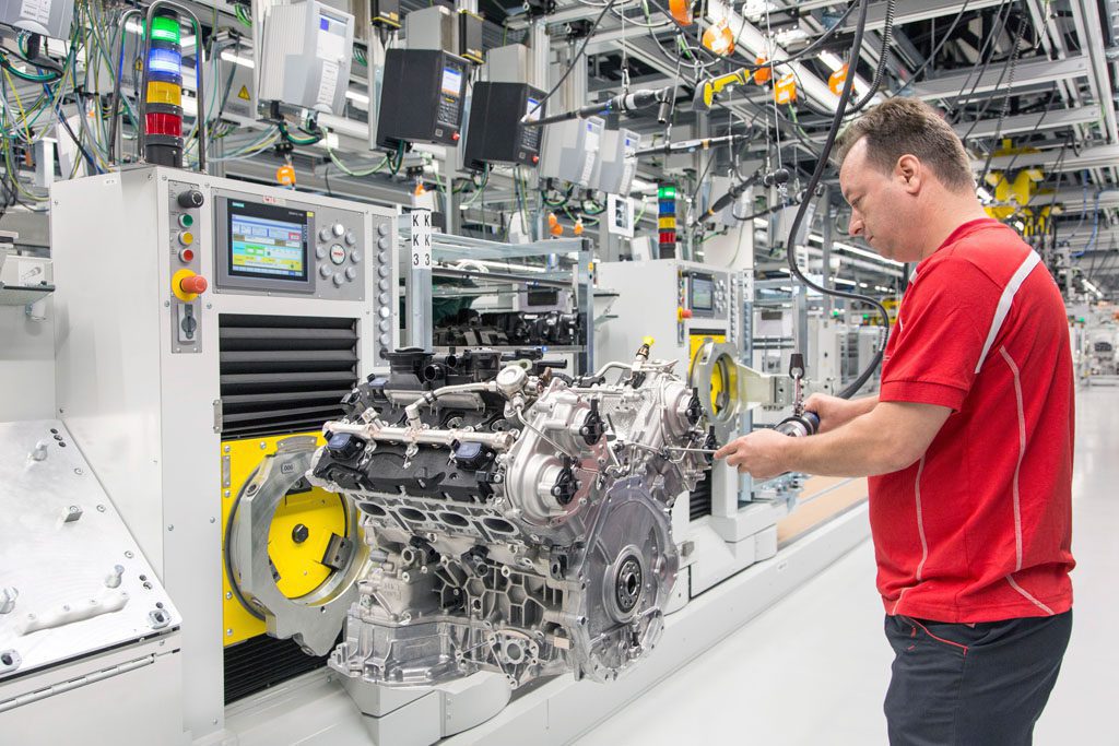 Gli strumenti elettrici sono altrettanto versatili. Le loro preimpostazioni, per esempio di coppia o numero di giri, si possono adattare in qualsiasi momento tramite la rete elettronica del sito. Ciò significa che non sono limitati ad un luogo specifico di utilizzo, ma possono essere impiegati in tutte le fasi di montaggio e devono solo essere agganciati alla nuova posizione di lavoro, in gergo produttivo “sincronizzati” e programmati in base alla nuova attività. Inoltre, grazie alla facilità di utilizzo, questi strumenti dall’ergonomia ottimizzata semplificano il lavoro del personale. Ogni 3,5 minuti parte l’assemblaggio di un nuovo motore. 95 portapezzi trasportano i propulsori lungo la catena di montaggio a forma di U e lunga 432 metri. In 110 cicli lavorativi, di cui 71 nelle aree manifatturiere, dopo 6,2 ore nasce il propulsore a otto cilindri. Nel processo produttivo dei nuovi motori otto cilindri a V, Porsche sfrutta a fondo i vantaggi offerti da digitalizzazione e gestione dei dati.