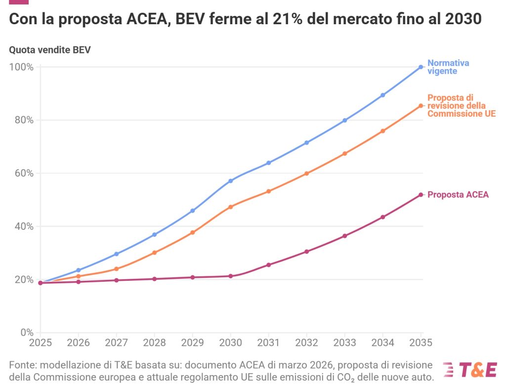 Secondo le stime dell’organizzazione, se queste richieste venissero accolte, nel 2035 le auto elettriche potrebbero rappresentare appena il 52% del mercato invece del 100% previsto, e le vendite di veicoli a batteria potrebbero restare inchiodate all’attuale 21% per tutto il resto del decennio, invece di raggiungere il 57% che le norme vigenti renderebbero possibile entro il 2030.