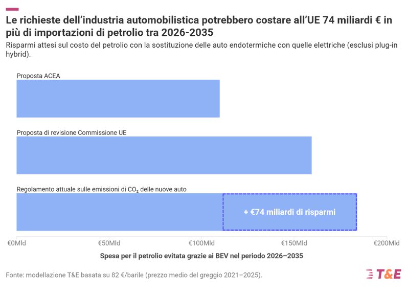 Il numero che T&E spiattella con più vigore sono 74 miliardi di euro: la cifra aggiuntiva che l’UE spenderebbe in importazioni di petrolio tra il 2026 e il 2035 se le richieste dei costruttori venissero accolte.