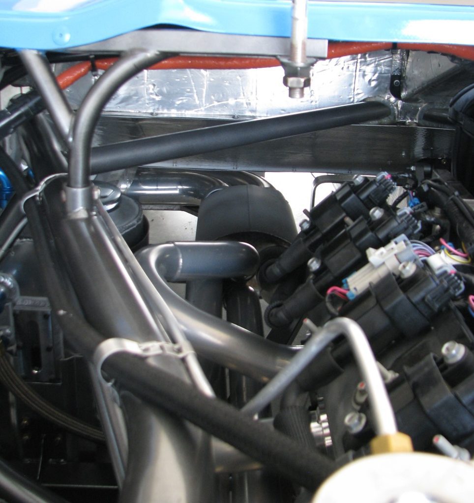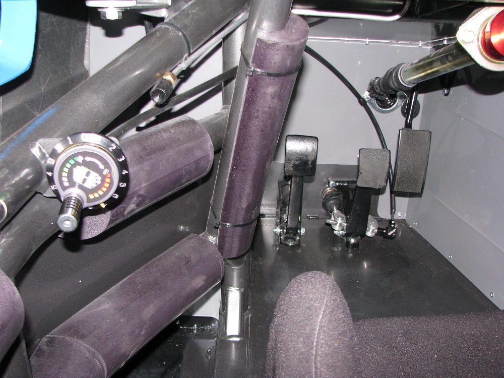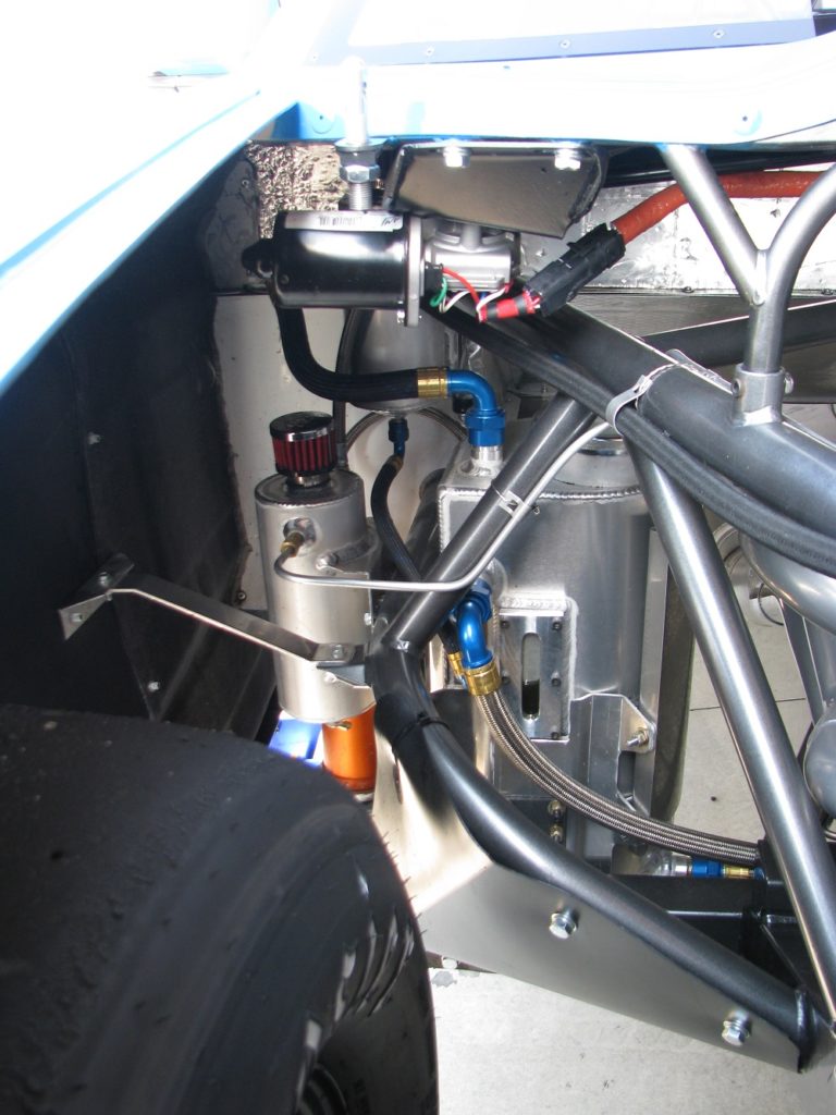 antirollio non regolabile. Per variare l’angolo di camber vi sono degli appositi spessori posti tra l’attacco del triangolo superiore e il piano sul telaio, mentre l’altezza da terra può essere modificata facendo scorrere le apposite ghiere sul gambo filettato dell’ammortizzatore. Al posteriore c’è un ponte rigido, con puntoni laterali e barra stabilizzatrice Panhard. Per completare il discorso relativo all’asseto non possiamo non segnalare l’utilizzo di pneumatici Hoosier da 27.0×10.0 – 15 su cerchi da 10Jx15” sia all’anteriore che posteriore, perché gli pneumatici di tipico stile americano con spalla molto alta comportano un certo “movimento” della vettura nella fasi di curva e soprattutto nei cambi di direzione, perciò è facile prevedere che la variazione di pressione sarà un valore molto sensibile, peraltro da adattare alle caratteristiche di guida del pilota. L’impianto frenante utilizza doppie pompe freno, con ripartitore di frenata sui due assi, e dischi auto ventilati da 304 mm all’anteriore e 293 mm al posteriore, rispettivamente accoppiati a pinze Wilwood a sei e quattro pompanti.
