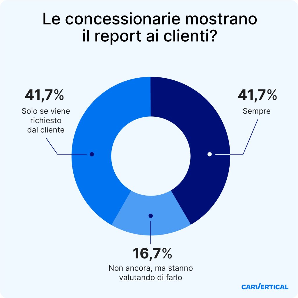 Oggi oltre il 40% dei concessionari italiani utilizza i report di storico come parte integrante della trattativa: c’è chi li mette sul tavolo fin dal primo contatto con il cliente (41,7%), e chi li condivide su richiesta (un altro 41,7%).