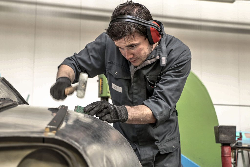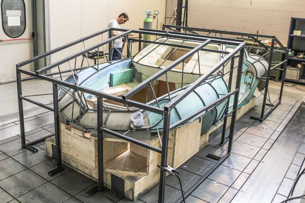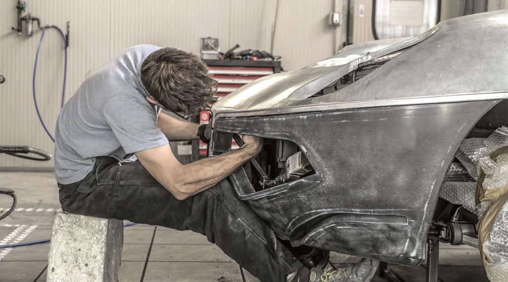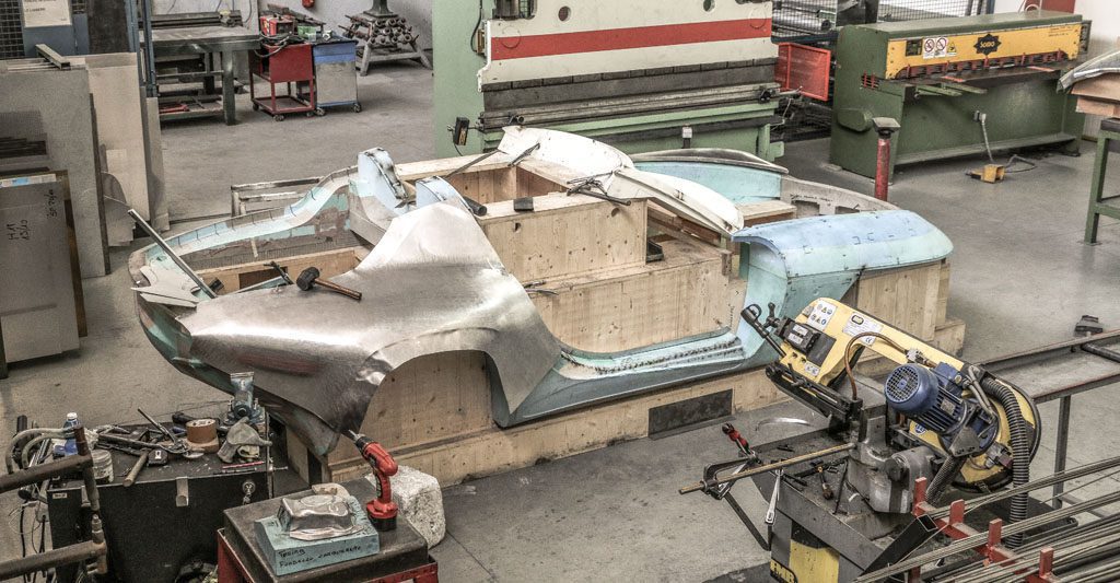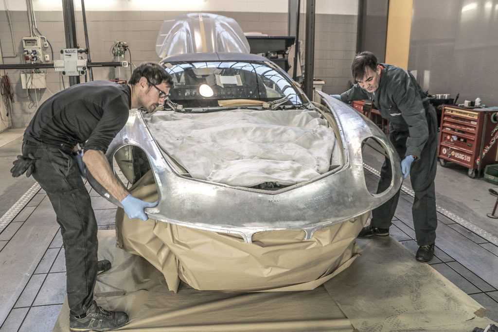Per la massima precisione e qualità ogni elemento in carbonio è prodotto per infusione sottovuoto a 120°. Cofano e portellone sono in sandwich di Nomex per maggior rigidità e assorbimento di vibrazioni e rumorosità. Particolarmente prezioso il portellone coperchio del baule, con il guscio interno in carbonio a vista. I pannelli di alluminio sono battuti a mano negli atelier milanesi di Touring Superleggera su un modello di Epoxy in scala 1:1 che riproduce perfettamente le forme volute. Per assemblare le pelli in alluminio con le sottostrutture di carbonio si usa l’incollaggio con colle dalle proprietà strutturali. Questa tecnica, che aumenta la rigidità, prevede l’incollaggio in ambienti a temperatura e umidità controllate.