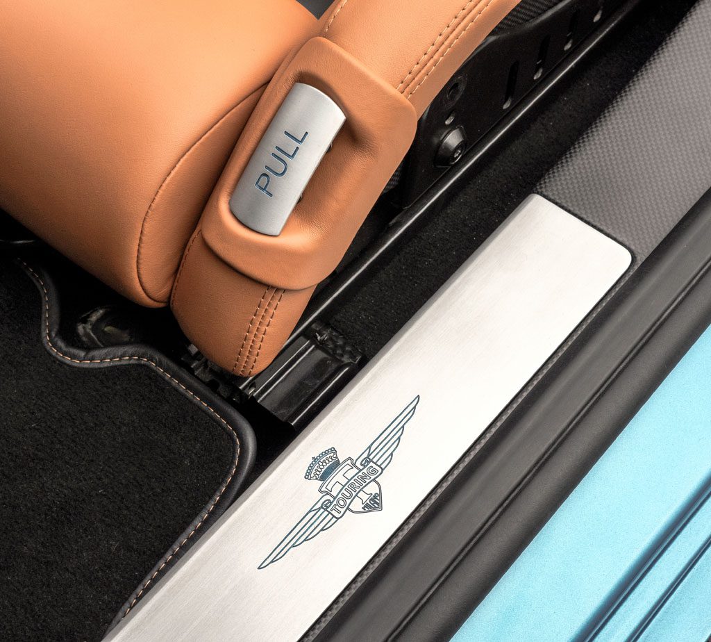 Touring Superleggera ha scelto il carbonio per il cofano, il paraurti/calandra e lo splitter anteriore, le minigonne, la cornice del parabrezza, il tetto amovibile, la traversa posteriore, il coperchio del baule, l’estrattore, e il profilo posteriore. Spessori e orientamento delle fibre sono studiati per il miglior rapporto peso/rigidità.