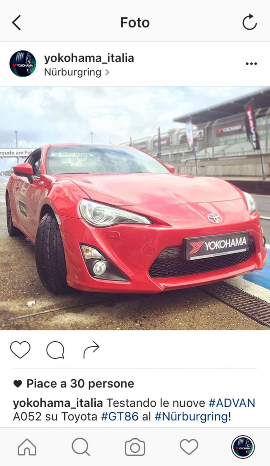 Dato il forte potere evocativo ed emozionale delle immagini e dei video di auto quando raccontano ad esempio avventure del Motorsport o mostrano novità sui test di prodotto e veicoli ad alte prestazioni, Yokohama Italia ha deciso di sfruttare al meglio Instagram postando tutti gli scatti più significativi in grado di rappresentare al meglio il marchio attraverso le sue numerose attività . L’account Instagram di Yokohama Italia – www.instagram.com/yokohama_italia – è stato aperto in giugno e nel giro di un mese ha radunato circa 350 follower: un numero incoraggiante, testimone dell’interesse che il brand e la sua immagine sportiva e passionale riescono a suscitare. Anche gli altri profili social di Yokohama Italia, da Twitter (twitter.com/YokohamaItalia) a YouTube (www.youtube.com/user/YokohamaItalia), registrano una costante crescita: in particolare, la pagina Facebook (www.facebook.com/YokohamaItalia) ha raggiunto 68.900 fan. Yokohama è estremamente legata alla propria essenza sportiva, alla componente estetica dei propri prodotti e alla qualità della comunicazione. Per questo le possibilità offerte da Instagram, sia in termini di pubblico sia di caratteristiche del media stesso, si addicono alle specificità del brand e lo rendono quindi uno dei migliori canali attraverso cui trasmettere questo carattere fatto di passione e prestazioni.